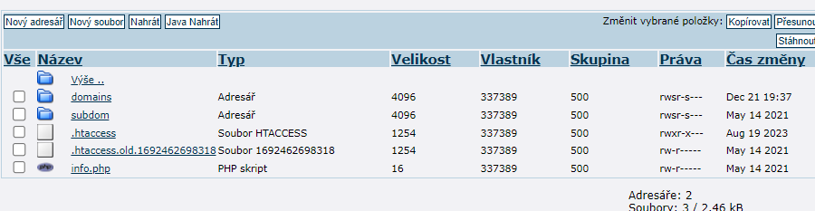 To znamená, že data webu musíte mít ve složce /www/domains/domena.tld (domena.tld podle vaši domény nebo aliasu) a ve složce /www jen náš výchozí soubor .htaccess.