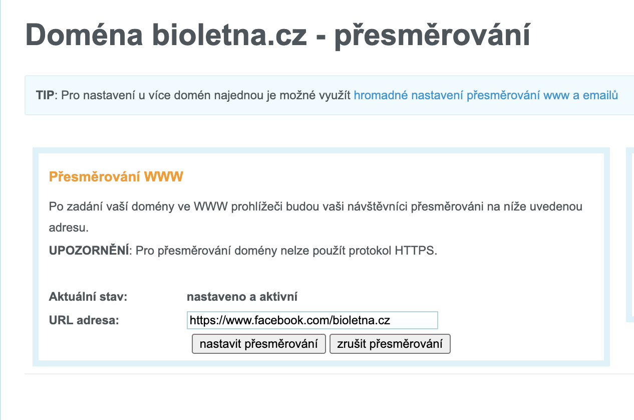 Dobrý den. Nedaří se mi přesměrovat doménu bioletna.cz na https://www.facebook.com/bioletna.cz. DNS jsou na Wedosu. Děkuji za radu.