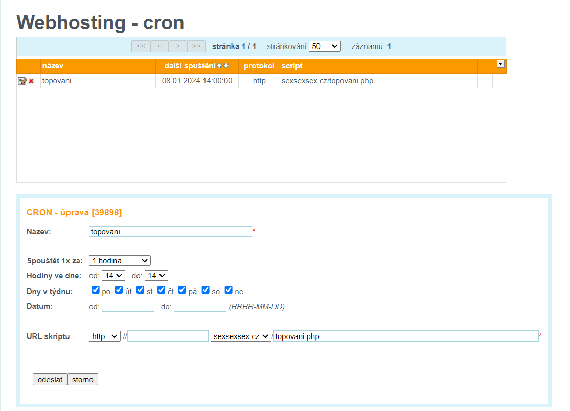 Ve Webhosting – Cron jsem vytvořil Cron, který se spustí v celou hodinu (pro zkoušku, že to bude fungovat. Poté přenastavím na půlnoc). Pokud kliknu na „Ověřit možné spuštění“ tak mi napíše „CRON topovani (http://sexsexsex.cz/topovani.php) je možné spustit“ což je dobré znamení. Ale když zkouším zapnout Cron manuálně, tudíž do prohlížeče zadám URL adresu „http://sexsexsex.cz/topovani.php“ tak mi vypíše následující chybu: