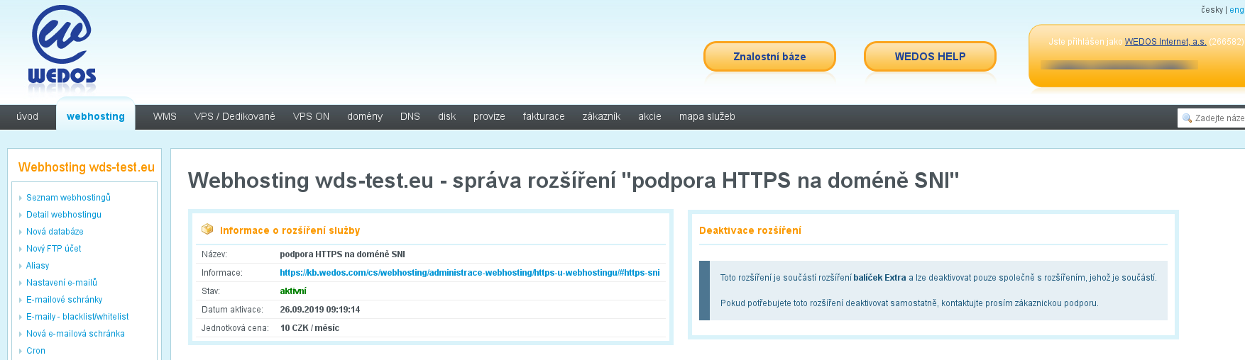 v rámci balíčku Extra je k dispozici také příplatková služba HTTPS SNI. Při deaktivaci balíčku Extra je potřeba osamostatnit službu HTTPS SNI, pokud si ji přejete zachovat. Prozatím to můžeme provést jen my na zákaznické podpoře, stačí nás jakýmkoli způsobem kontaktovat.