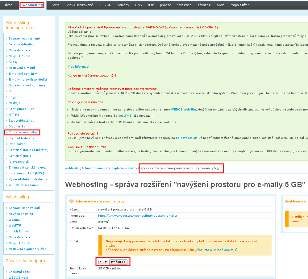 ze seznamu webhostingů vyberte Váš webhosting trinomprerov.cz, v panelu nalevo pak příplatkové služby a zde kliknete na ikonu lupy na řádku u příplatkové služby navýšení prostoru pro e-maily 5 GB.