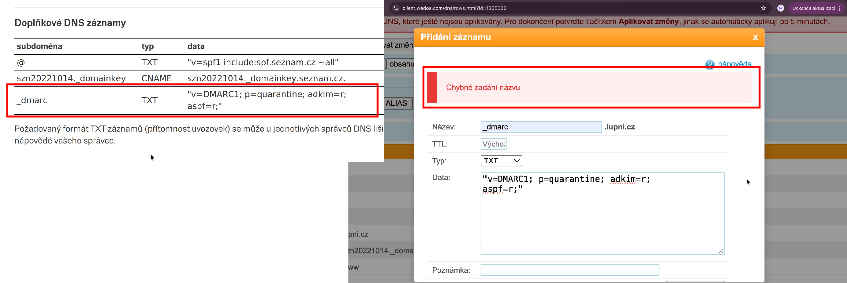 Doplňkové záznamy DNS_TXT (Wedos x Seznam, webmail)