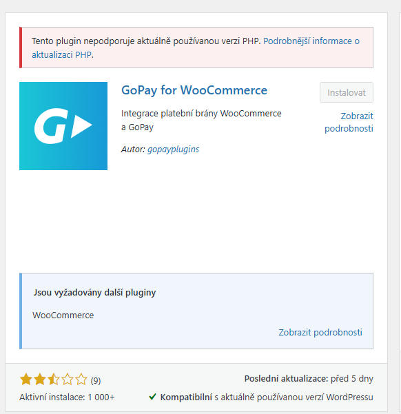 když chceme instalovat plugin u GoPay for WooCommerce se zobrazuje hláška