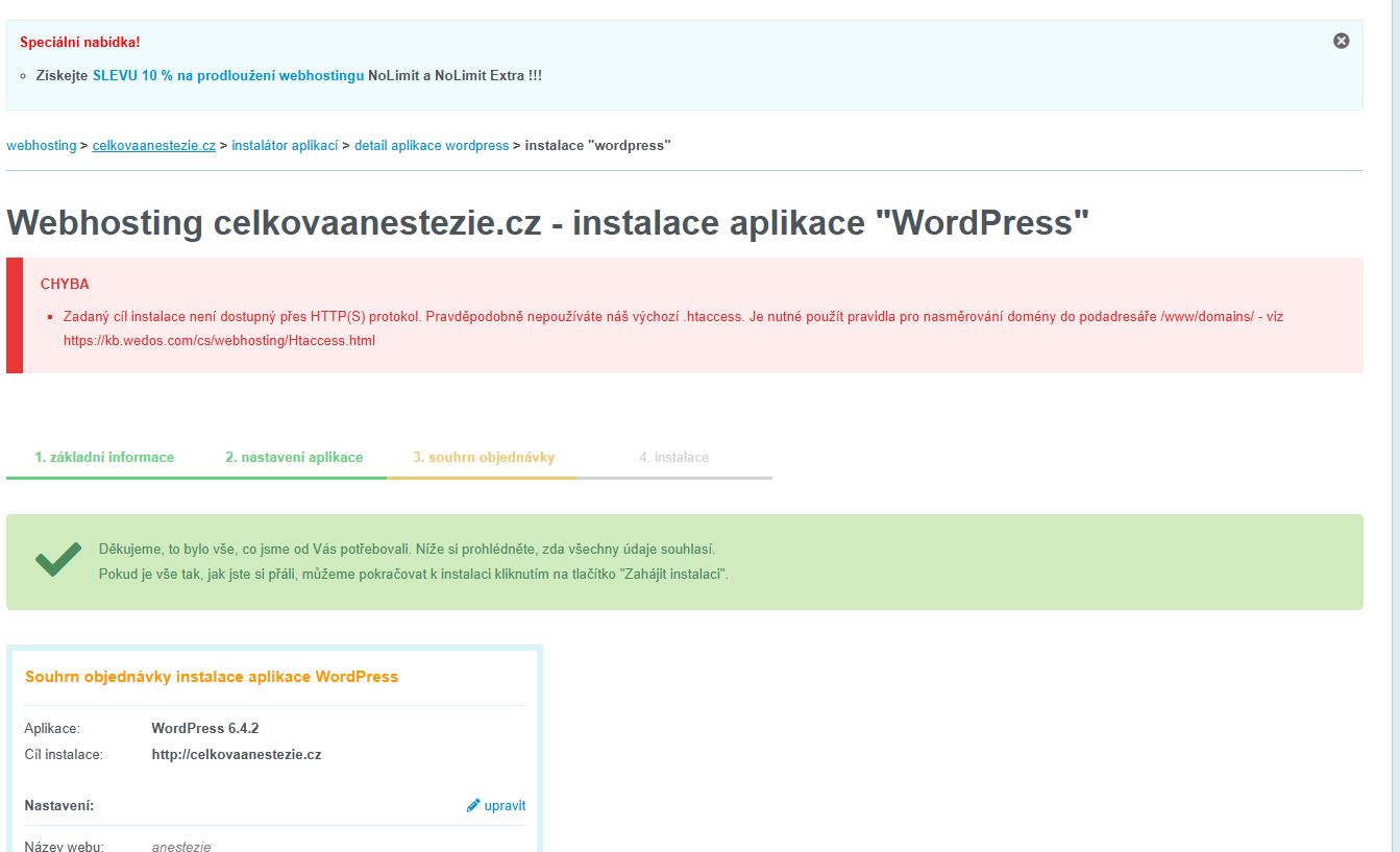Hezký den, nedaří se mi naintalovat wordpress. Píše to tuhle chybu. Prosím mohl byste instalaci spustit vy?