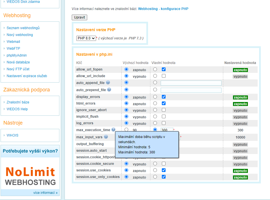 Nastavení PHP konfigurace lze provést svépomocí. Otevřete si, prosím, uživatelskou administraci -> detail webhostingu -> konfigurace PHP. Volitelné parametry lze upravit. Úpravy se projeví do cca 30 minut od aplikování změn.