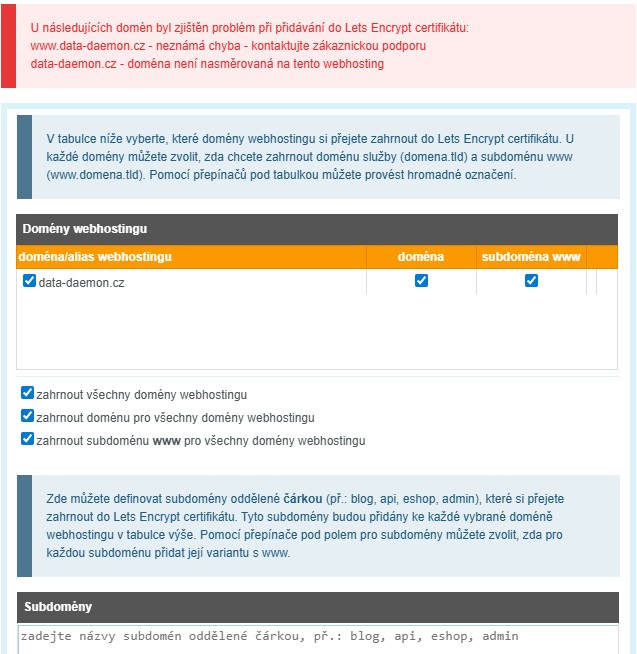 Nefunguje přidělení certifikátu Let’s Encrypt, neustále to vypisuje chyby, můžete mi prosím poradit?