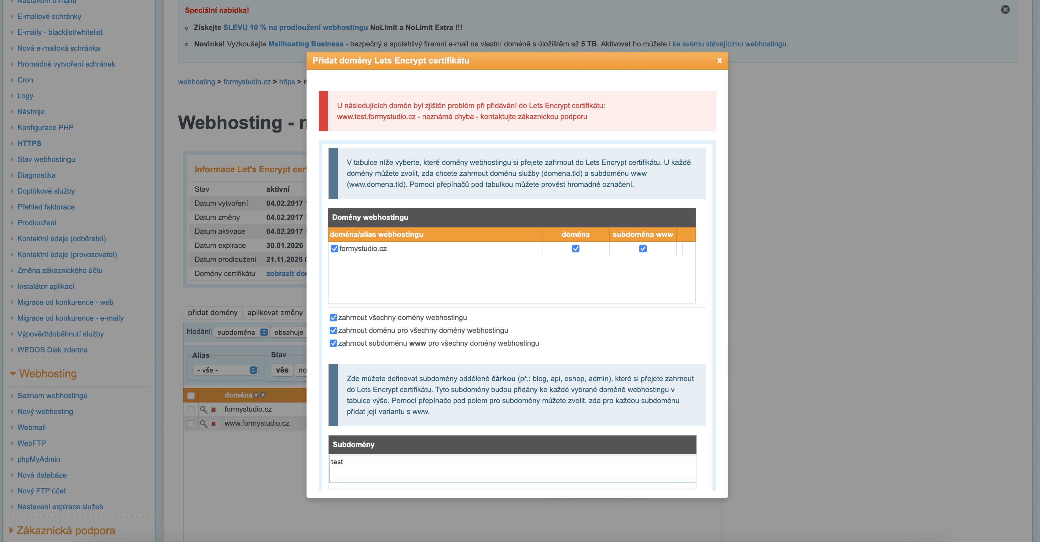 subdoménu www.test.formystudio.cz nemáte na webhosting formystudio.cz nasměrovanou. Zkuste si prosím tuto subdoménu pomocí DNS záznamů na tento webhosting nasměrovat. DNS záznamy je možné upravit pomocí tohoto návodu. Do 60 minut po nastavení DSN záznamů bude možné subdoménu www.test.formystudio.cz na webhostingu do SSL certifikátu přidat.