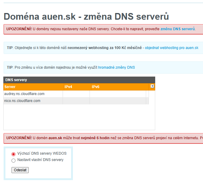 Ďakujem za odporúčanie, no skúšam to už tretí deň a stále spomínanú subdomenu vie resolvnuť iba server v Brazílii, ktorý správne smeruje na NS wedosu, ale zvyšok sveta nič… viď: