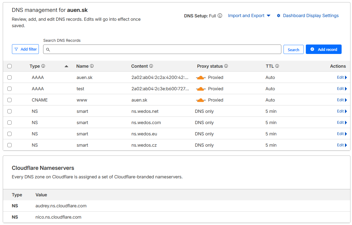 Ak som zaradil v konfiguracii wedosu v sekcii nameservery okrem tych od cloudflare aj ns-servery wedosu, tak mi to fungovalo (samozrejme nahoda, ked sa vybral resolver nahodne ten od wedosu a nie od cloudflare), čo ale nie je korektný setup. Primarne ns-servery chcem cloudflare, a aby sub.domena.sk cez NS zaznam smerovali na wedos a fungoval mi miniweb.