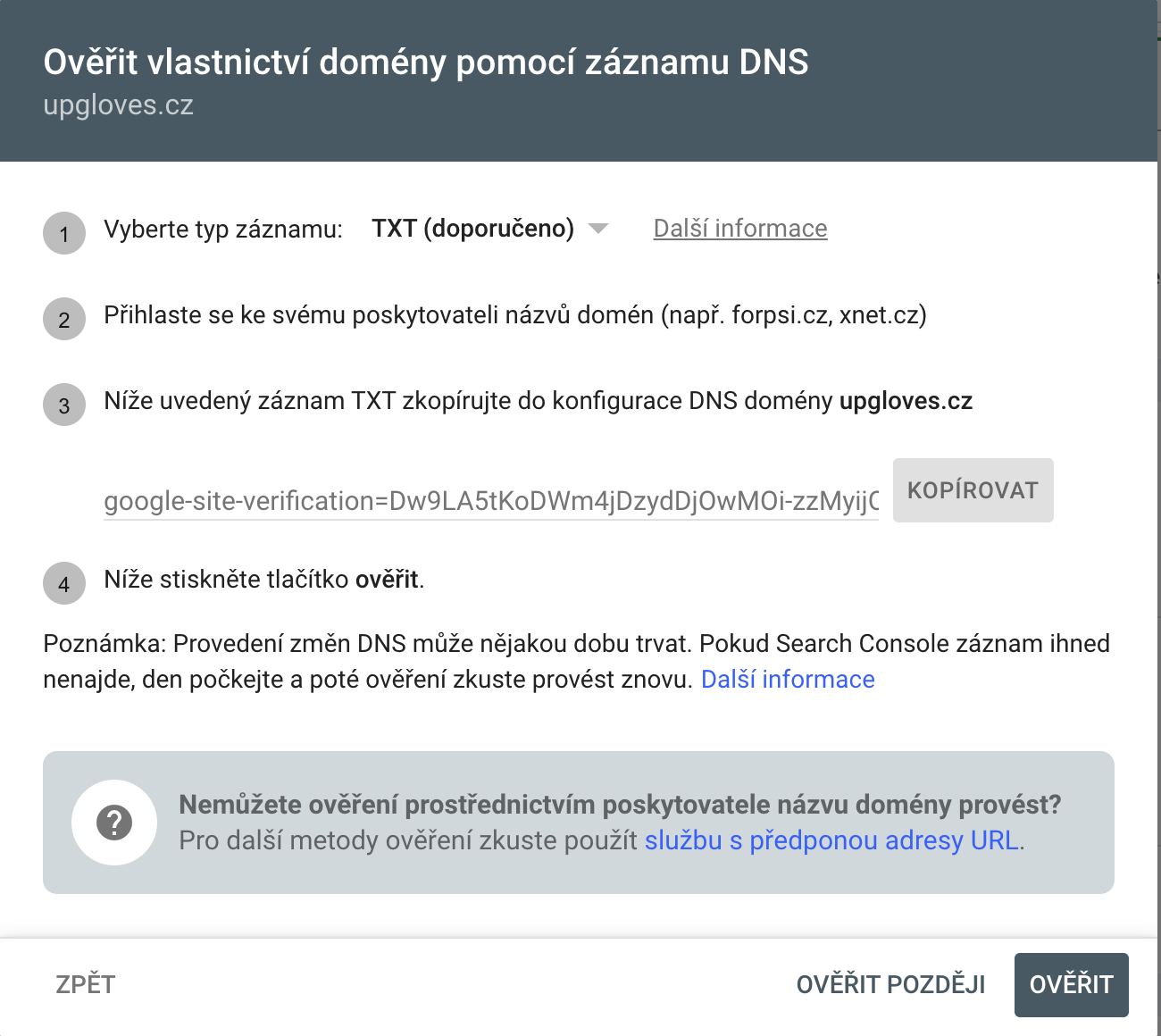 TXT záznam nastavíte dle tohoto postupu: https://kb.vedos.cz/dns-zaznamy/