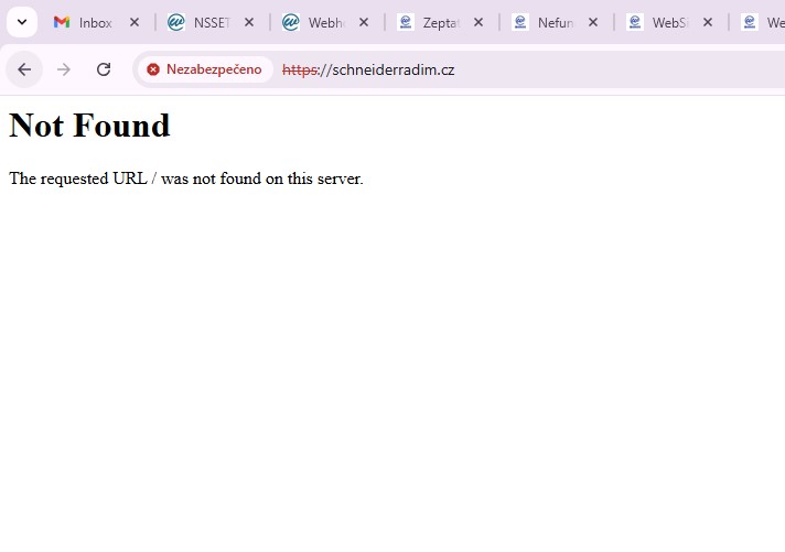 na webhostingu schneiderradim.cz jste si zatím žádný certifikát nevygenerovala. V tomto případě je třeba si doménu do certifikátu přidat a dále ho vygenerovat. To můžete udělat v zákaznické administraci zde pomocí tohoto návodu. Po přidání domén nezapomeňte kliknout na tlačítko „aplikovat změny“, certifikát se následně do 60-ti minut vygeneruje.