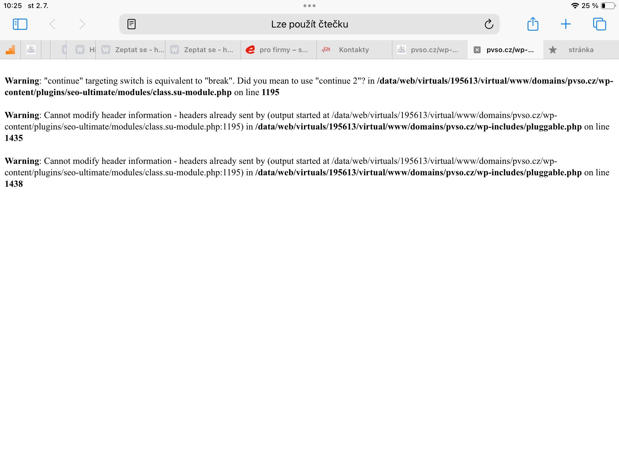 Dobrý den, kvůli aktualizaci WordPress, který vyžadoval aktualizaci php na vyšší, jsem provedla volbu Konfigurace PHP. Po tomto mi však web přestal fungovat, tak jsem dala konfiguraci zpět a nyní mám na webu pvso.cz chybovou hlášku a vůbec mi nefunguje administrace ve wordpressu.