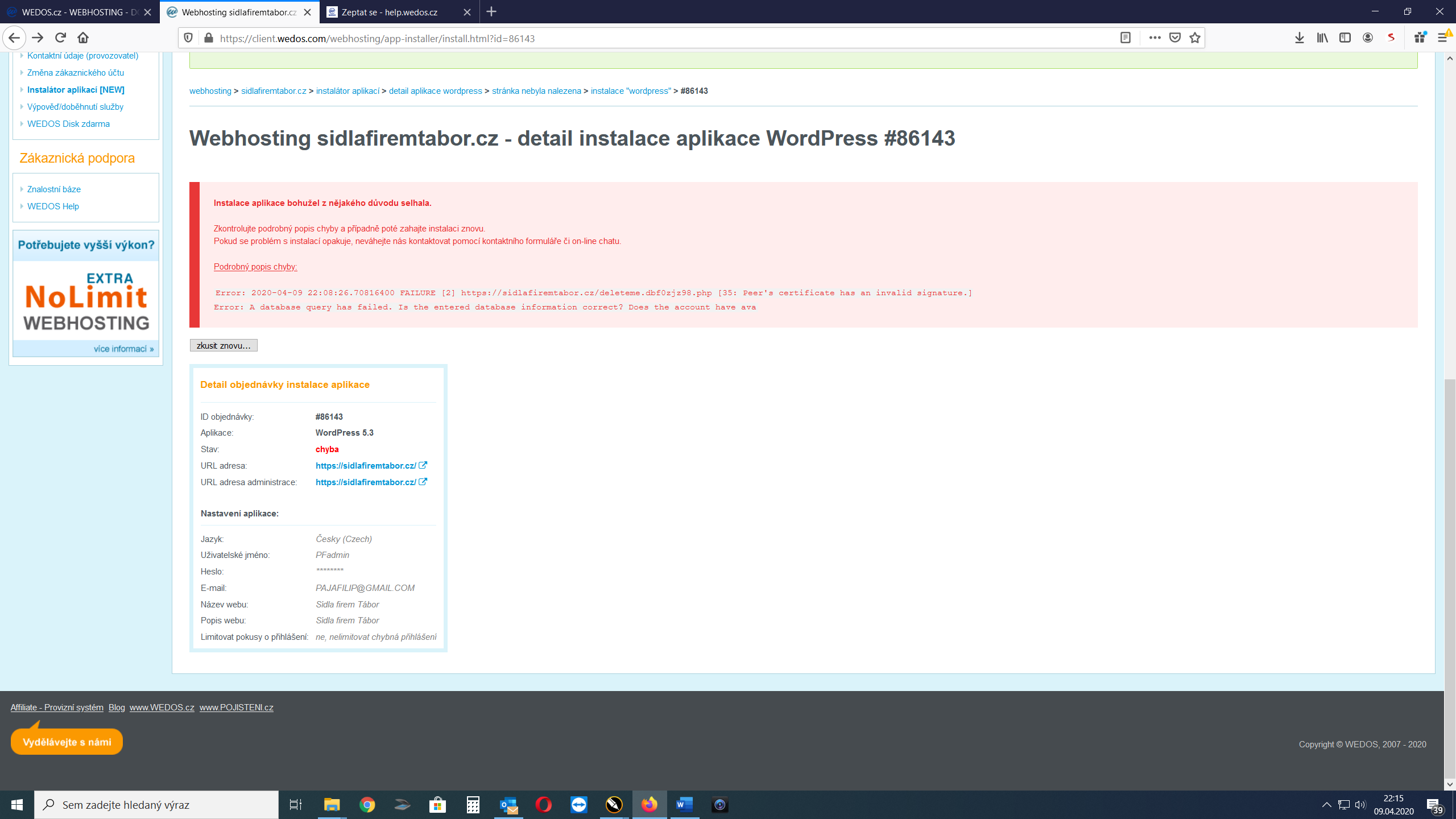 Instalace aplikace bohužel z nějakého důvodu selhala. Zkontrolujte podrobný popis chyby a případně poté zahajte instalaci znovu. Pokud se problém s instalací opakuje, neváhejte nás kontaktovat pomocí kontaktního formuláře či on-line chatu. Podrobný popis chyby: Error: 2020-04-09 22:08:26.70816400 FAILURE [2] https://sidlafiremtabor.cz/deleteme.dbf0zjz98.php [35: Peer’s certificate has an invalid signature.] Error: A database query has failed. Is the entered database information correct? Does the account have ava