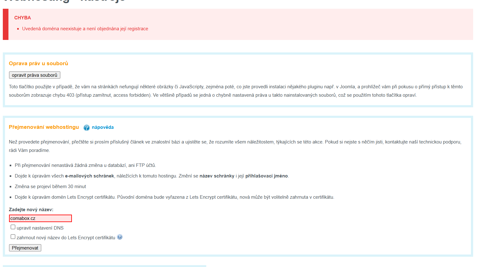 to objednáváte znovu i Webhosting. Ten vy nepotřebujete, přejmenujete si ten glowlamp.cz. Samotnou doménu comabox.cz si registrujete přímo zde.