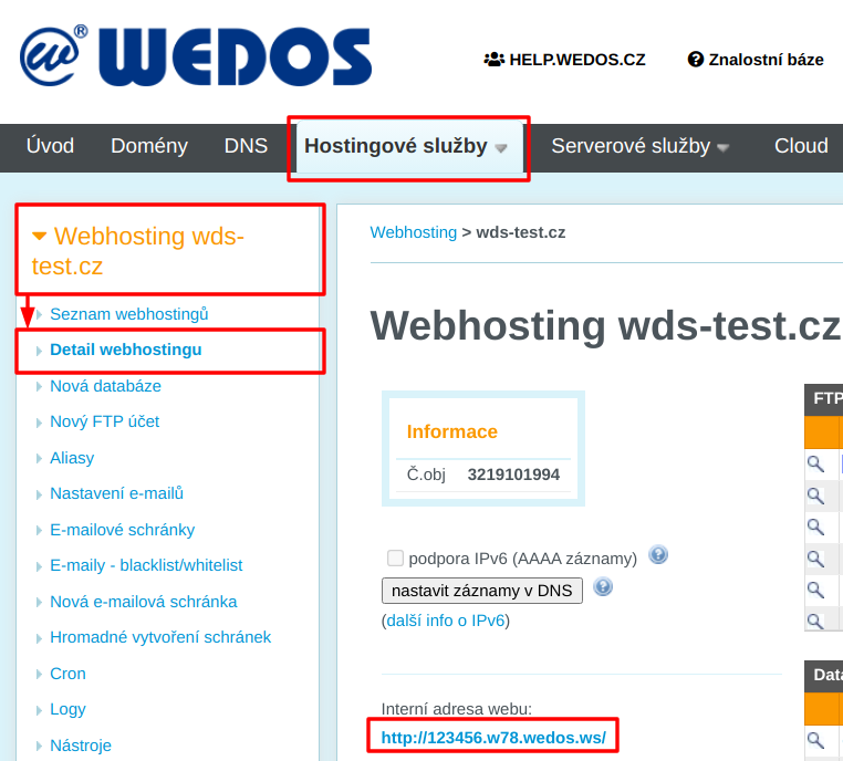 Interní URL najdete v detailu webhostingu: