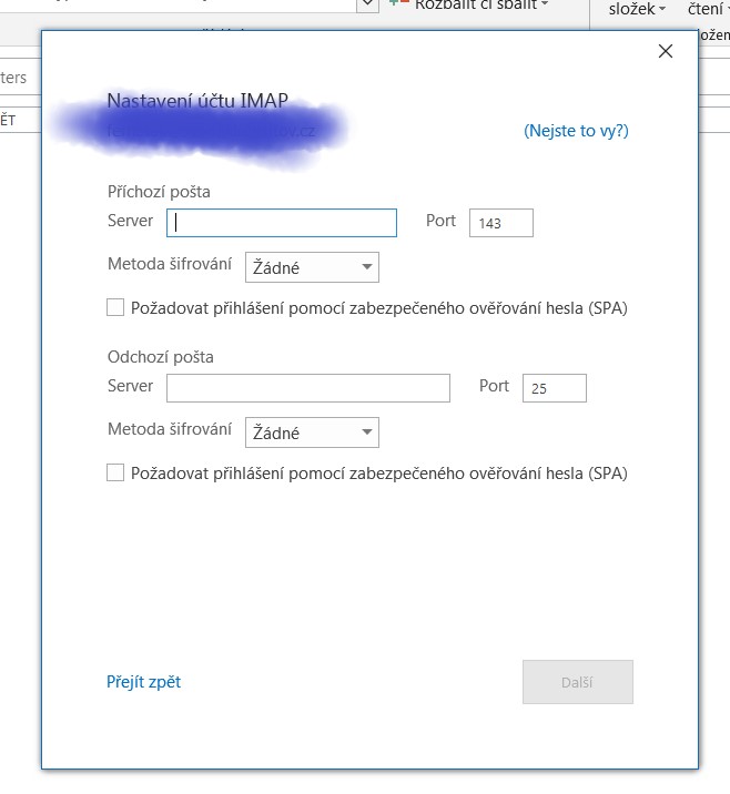 Po vytvoření nového účtu, program požaduje adresu, poté chce zvolit zda POP nebo IMAP, poté tuto tabulku pro nastavení, dále jen heslo….