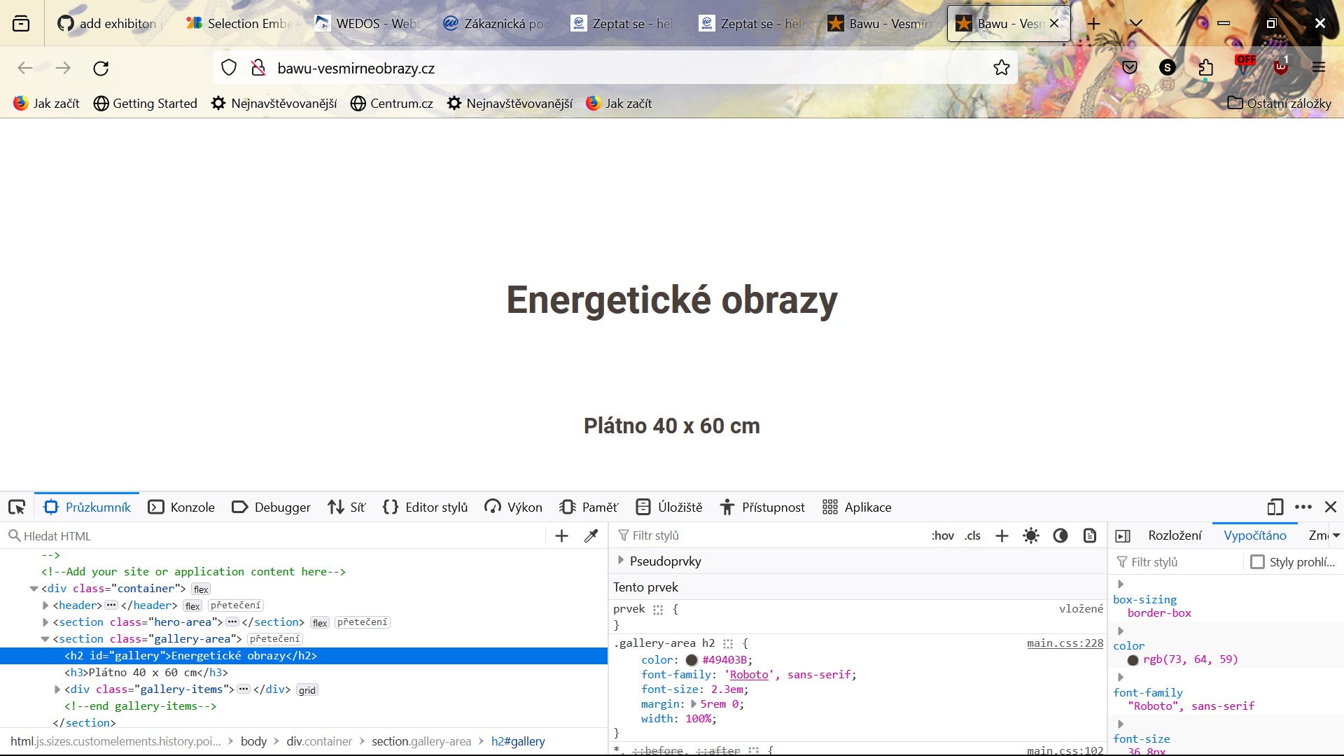 upravoval jsem obsah webu a po nahrání všech změněných souborů přes WebFTP jsem zjistil, že tloušťka fontu u nadpisů h2 a h3 v sekci galery-area neodpovídá požadovanému nastavení. Chtěl bych, aby měly tloušťku 300 jako na prvním obrázku v mojí lokální verzi stránek. Všechny potřebné soubory (index.html i main.css) jsou na webFTP nahrané, a přesto se na webu u těchto nadpisů vlastnost font-weight:300 vůbec neobjevuje, viz druhý obrázek, i když v souboru main.css, který je nahraný na web, je nastavená. V souboru index.html je font také importovaný přes link.