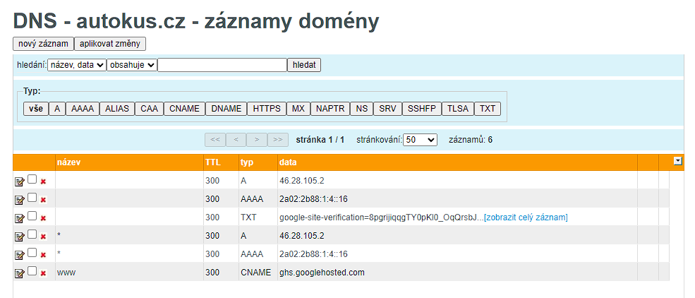 Pokud nemáte k těmto záznamům žádné konkrétní zadání od Google Sites, můžete zkusit A i AAAA záznamy smazat (všechny) a nahradit je záznamem typu ALIAS s daty ghs.googlehosted.com.